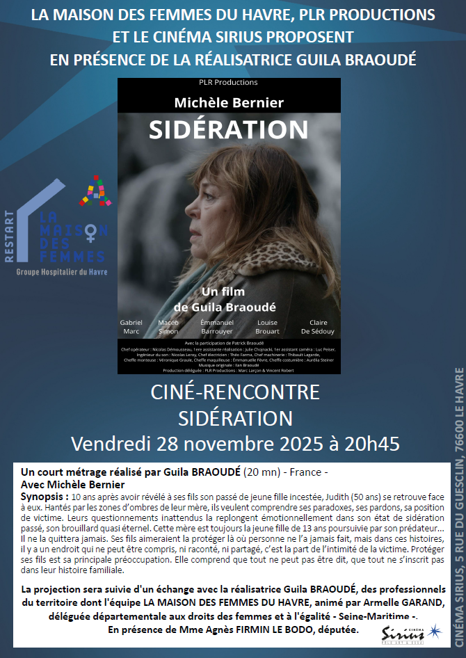 📽️La Maison des femmes du Havre , PLR PRODUCTIONS et le Cinéma Sirius proposent une soirée ciné-rencontre avec la projection de « Sidération », un court-métrage sur la thématique de l’inceste, vendredi 28 novembre, en présence de la réalisatrice Guila Braoudé.