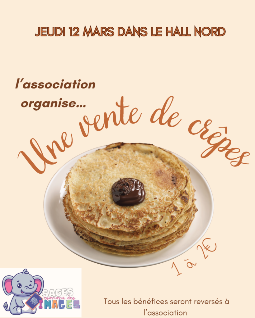 L’ Association Sages comme des images vous donne rendez-vous jeudi 12 mars dans le hall nord de l’hôpital Jacques Monod pour une délicieuse vente de crêpes ! 😋