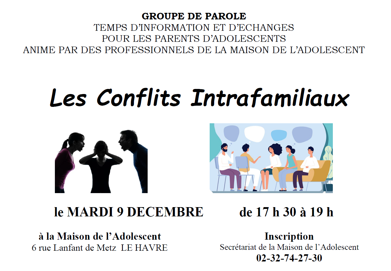 Les conflits intrafamiliaux | Groupe de parole – Mardi 9 décembre 2025 de 17h30 à 19h à la Maison de l’Adolescent