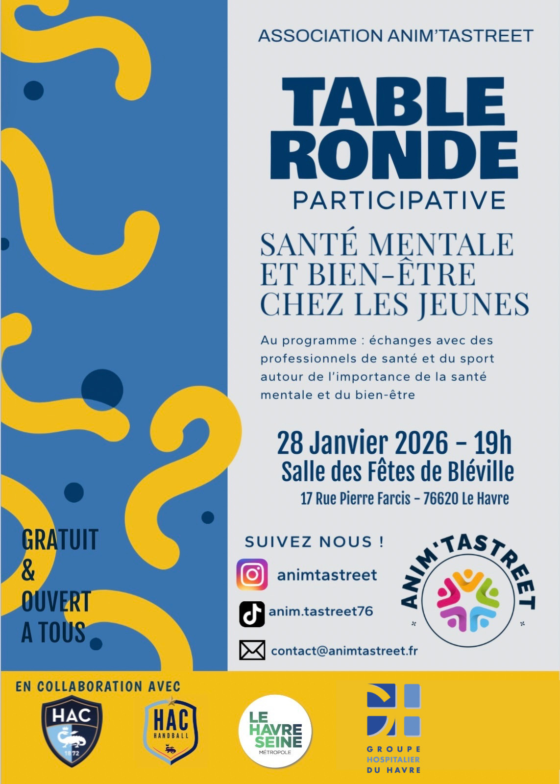 Nous avons le plaisir de vous inviter à une table ronde autour de thématiques fortes et actuelles organisée par l’association Anim’tastreet💡 Un moment d’échange, de réflexion et de dialogue, ouvert à toutes et à tous. 📍 Lieu : Salle des fêtes de Bléville 📅 Date : 28 janvier 2026 ⏰ Heure : 19h00 Venez écouter, […]